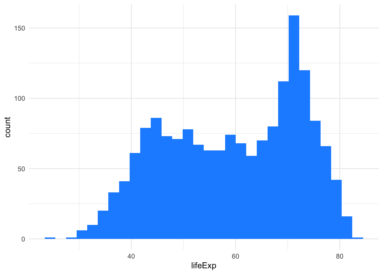 ggplot(gapminder, aes(x=lifeExp)) +