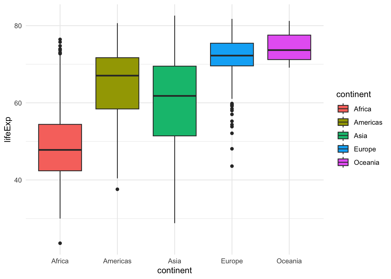 ggplot(gapminder, aes(x=continent, y=lifeExp, fill=continent)) +