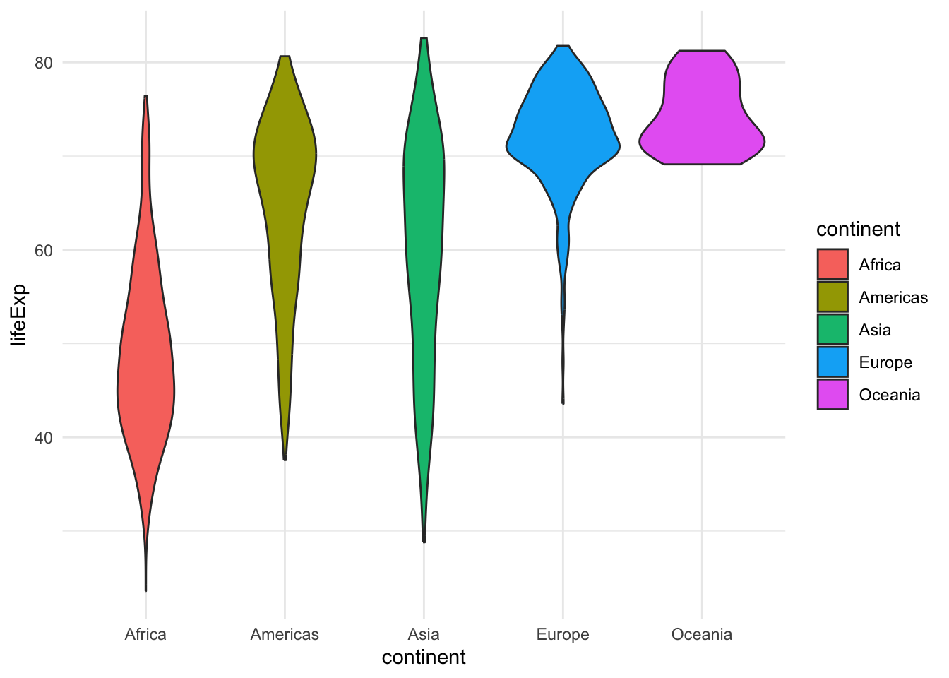Finally, if we want to visualize the distribution of life expectancy, we can do that by using histograms, boxplots, violin plots or ridgeline plots.