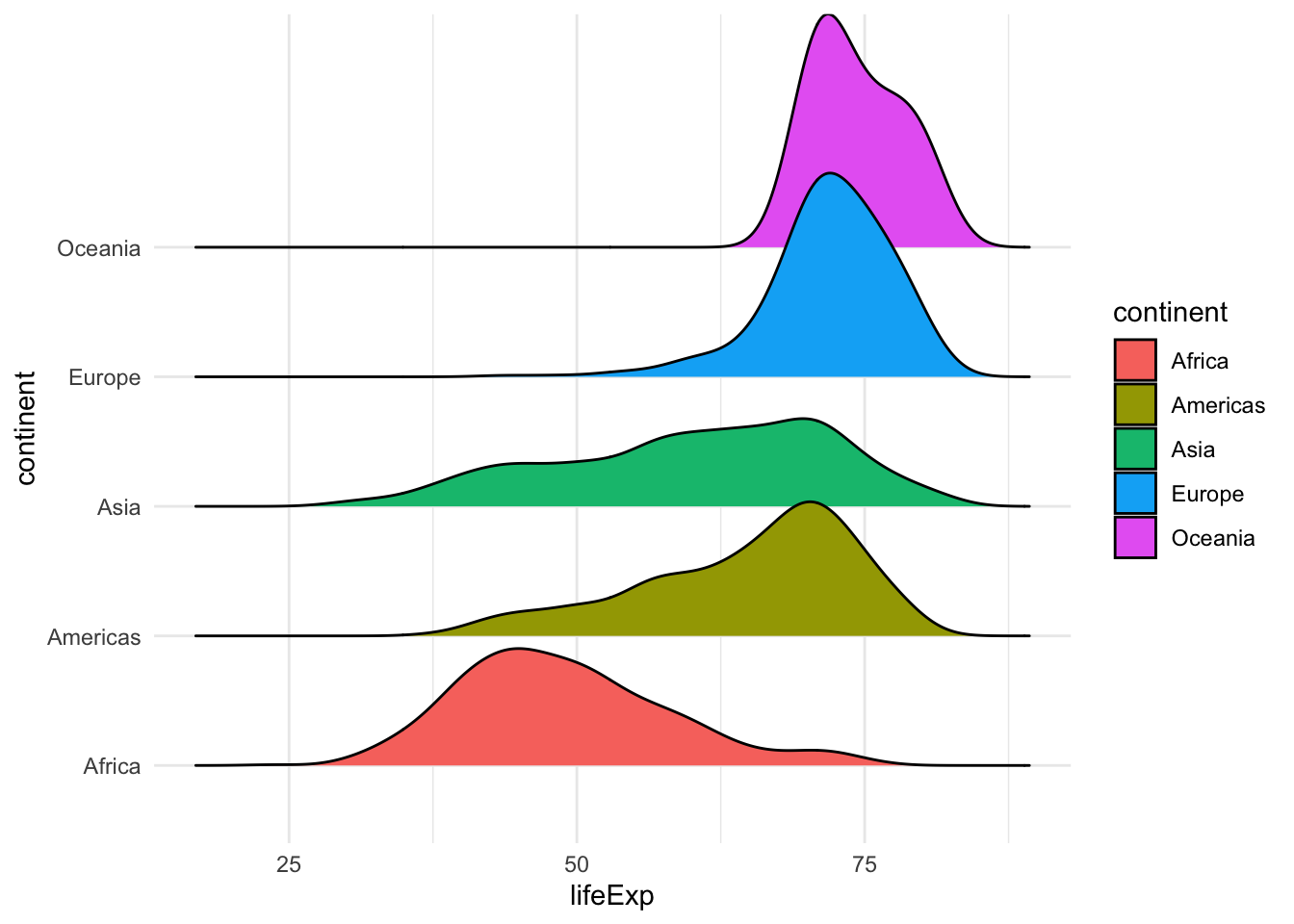 ggplot(gapminder, aes(y=continent, x=lifeExp, fill=continent)) +