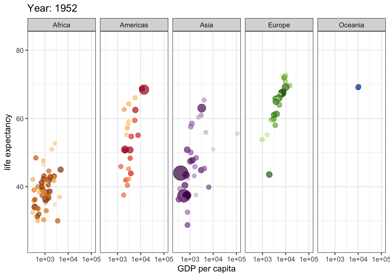 This is a great plot for 1962, but how do things change across the years? We could use facets to display a few years, but if we are going to explore all years, we need a dynamic plot.
