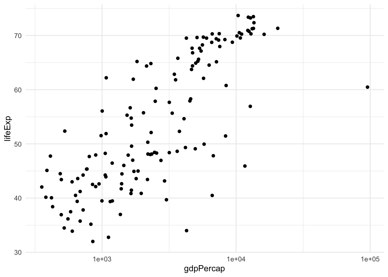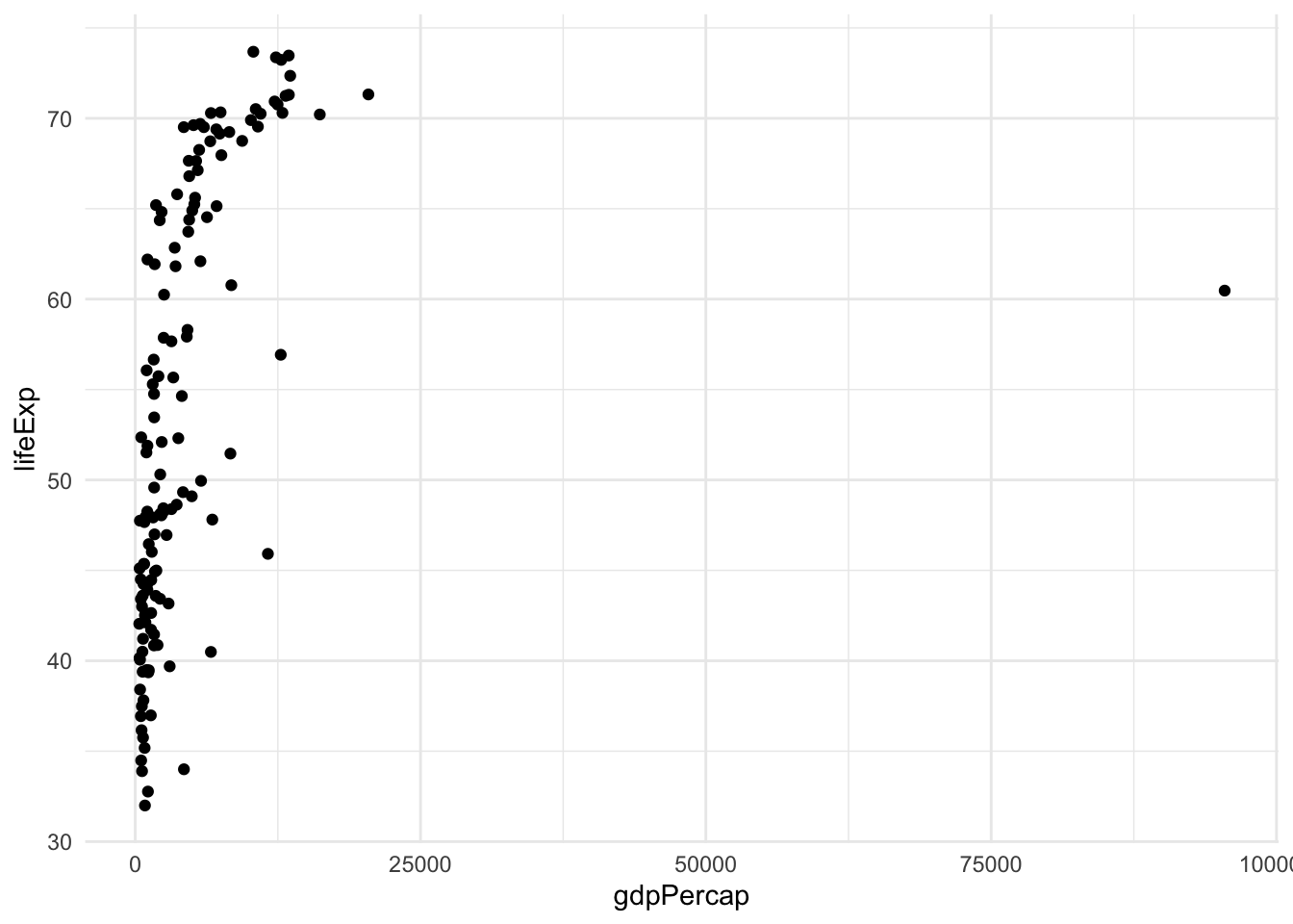 The last version of the plot is very close to an optimal representation of the data. This graphical summary raises some interesting questions, e.g., what is the country that sits by itself on the right-hand side of the plot? This is by far the richest country per capita, but its life expectancy is not very high.