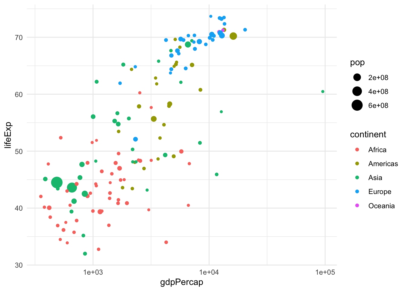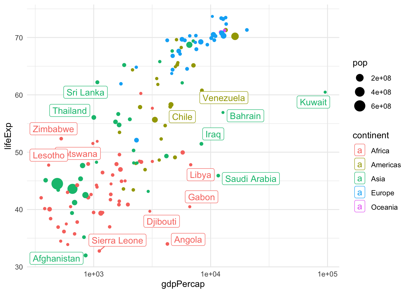 geom_density_2d) or hexagonal binning (geom_hex) to avoid overplotting. - Create a scatterplotof life expectancy vs. GDP per capita in 2007, with the point size proportional to population, color-coded by country, faceted by continent, adding text labels (hint: remove legend with