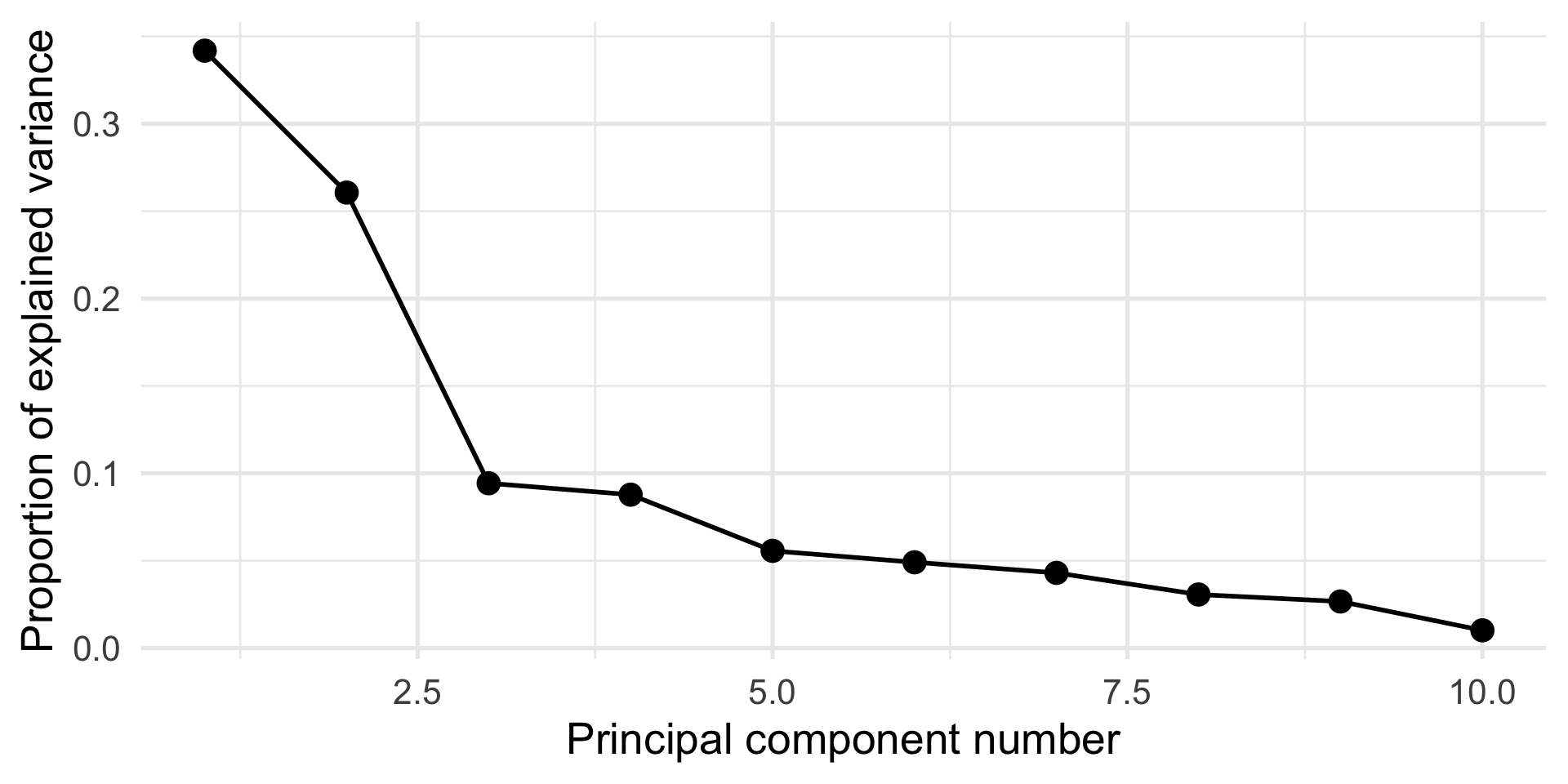 The proportion of total variation explained by the first \(K\) principal components is given by \[ p_K = \frac{\sum_{j=1}^K \lambda_j}{\sum_{j=1}^p \lambda_j}. \]