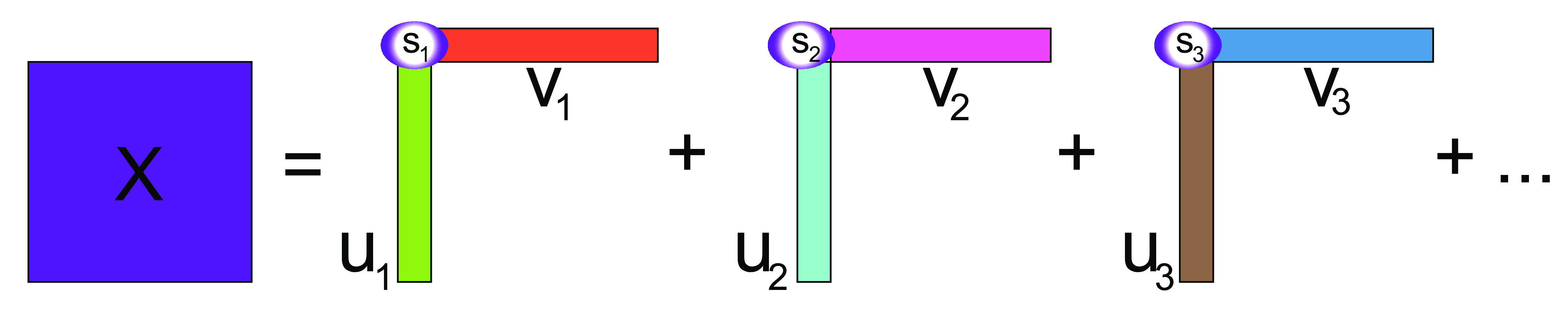 The intuition behind SVD is that it decomposes \(X\) into a sum of rank-one matrices, obtained by multiplying the columns of \(U\) and \(V\), weighted by the diagonal elements of \(D\).